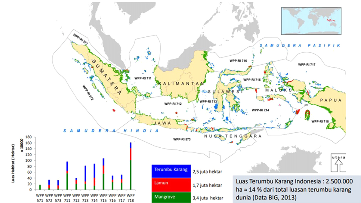 Secara umum ekosistem vital di pesisir dikenal dengan keberadaan hutan mangrove, padang lamun, dan terumbu karang. Rusandi [2020] menyatakan terumbu karang di Indonesia sekitar 2,5 juta hektar, padang lamun 1,7 hektar, dan hutan mangrove seluas 3,4 hektar.