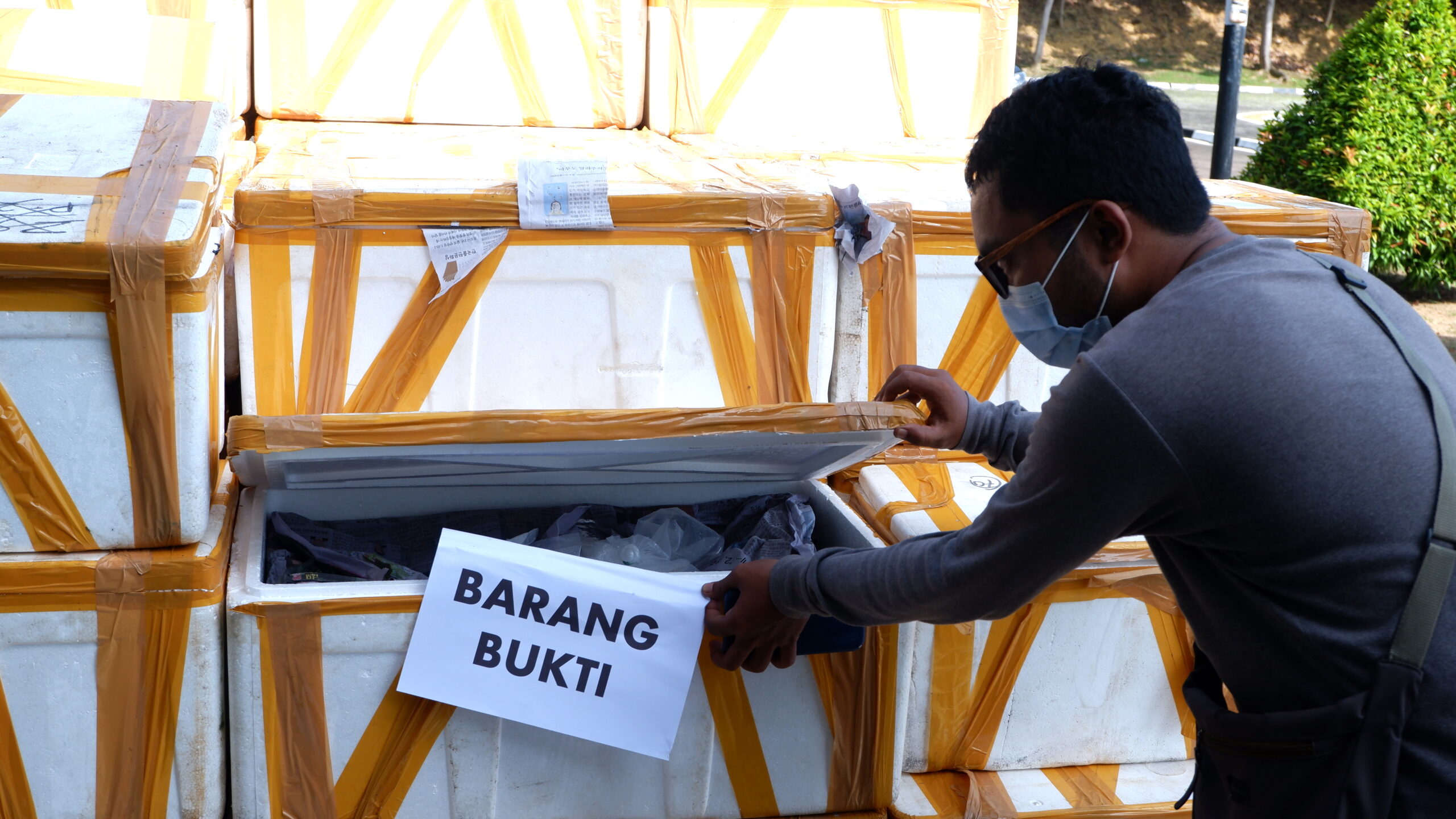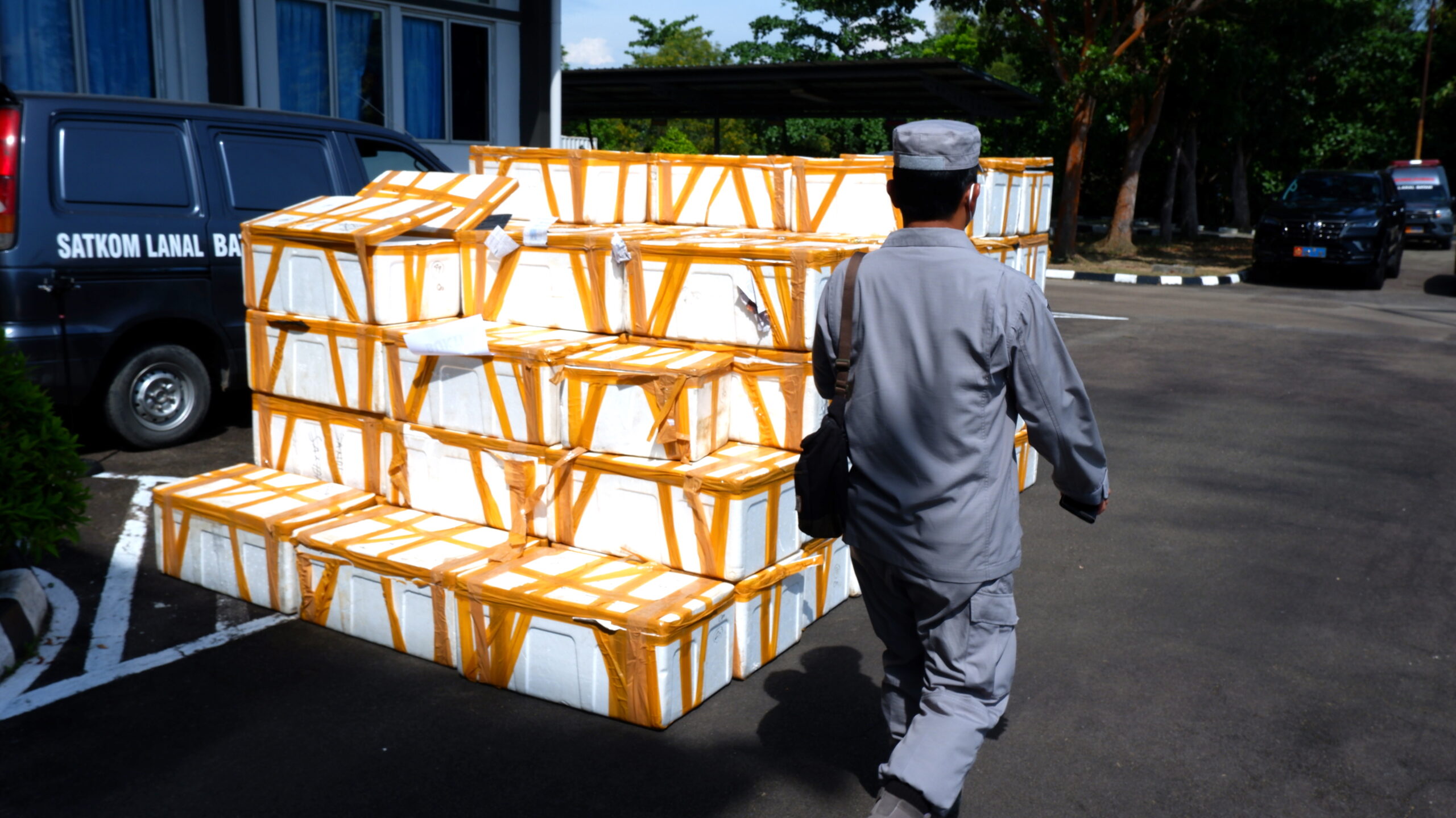 Puluhan styrofoam berukuran besar tertutup rapat tersusun rapi di depan Markas Komando Lanal Batam. Benda ini dijadikan tempat penyimpanan ratusan ribu baby lobster yang akan diselundupkan ke Vietnam dari Palembang, namun digagalkan TNI AL saat melintas di perairan Batam, Provinsi Kepulauan Riau (Kepri).