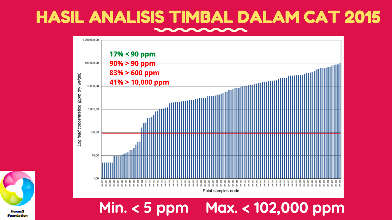 Sekitar 50% orang yang mudah terpapar adalah anak-anak karena lebih mudah menyerap dan berdampak pada IQ. Hasil analisis sampling cat kayu dan besi pada 2015 menyatakan sebanyak 78% produk mengandung timbal sangat tinggi, di atas 90 ppm sesuai standar WHO. Hanya 23% di bawah 90 ppm.