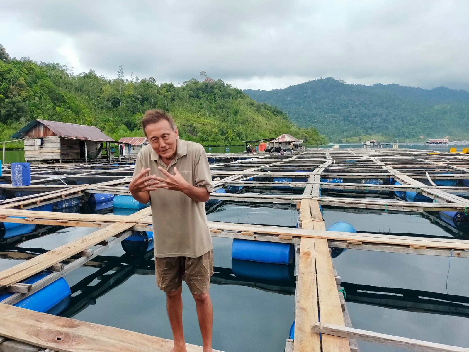 Pio, remaja pengemudi boat itu datang menjemput saya untuk mengantarkan ke keramba jaring apung (KJA) milik CV. Andalas Samudera Sejati (ASS) di kawasan Teluk Sungai Nyalo. KJA milik Ali Poluk (53) itu berjarak 15 menit dari pantai ke arah laut.