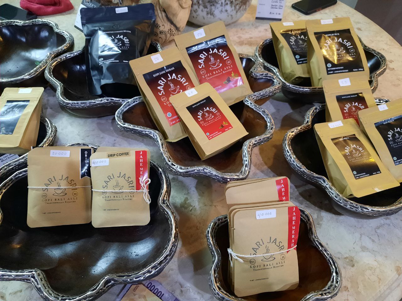 Di sudut lain ada I Made Suadnyana mengolah kopi robusta dari Kabupaten Buleleng jadi olahan kopi bubuk dengan variasi jahe merah dan rempah lainnya. Ia juga membuat kemasan ala kedai kopi dalam bentuk coffee drip. “Tidak perlu alat penggiling dan mesin kopi, langsung seduh dari kantong kopinya,” ia meyakinkan.