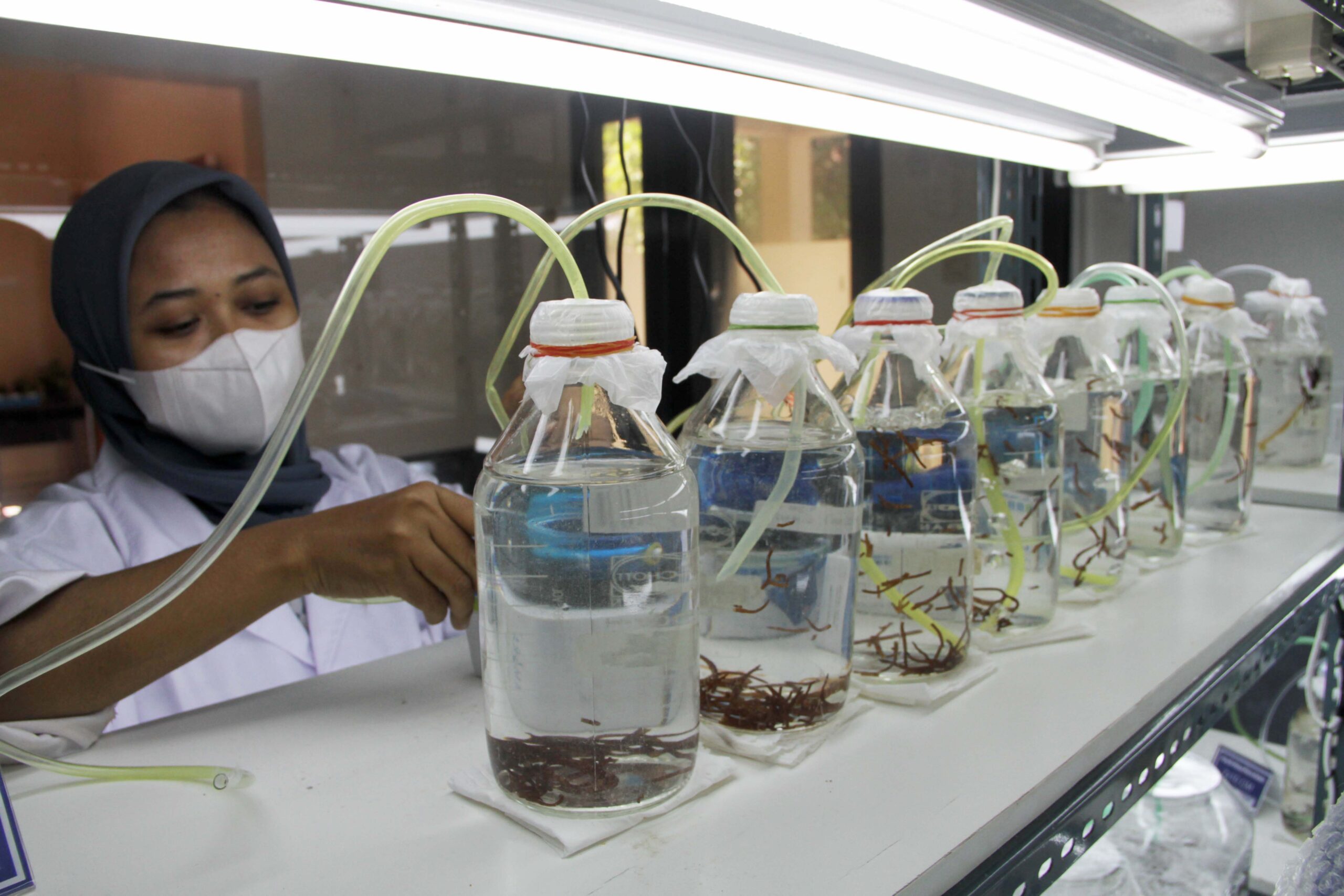 “Untuk bibit rumput laut yang kita ambil dari alam perlakuannya hampir sama semua, kita lakukan aklimatisasi terlebih dulu,” terang Wiwien saat ditemui di ruang kerjanya, awal Juli 2022.