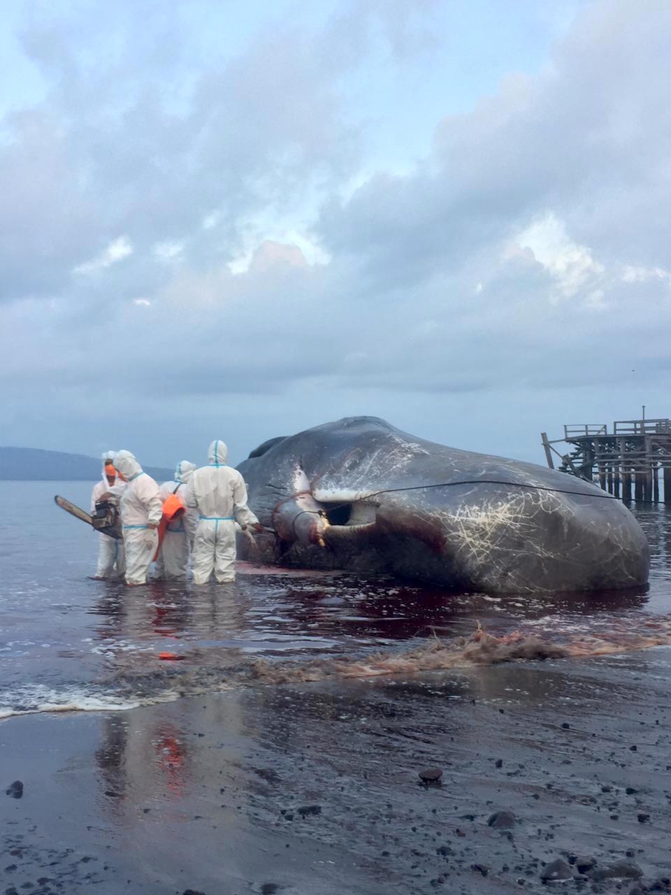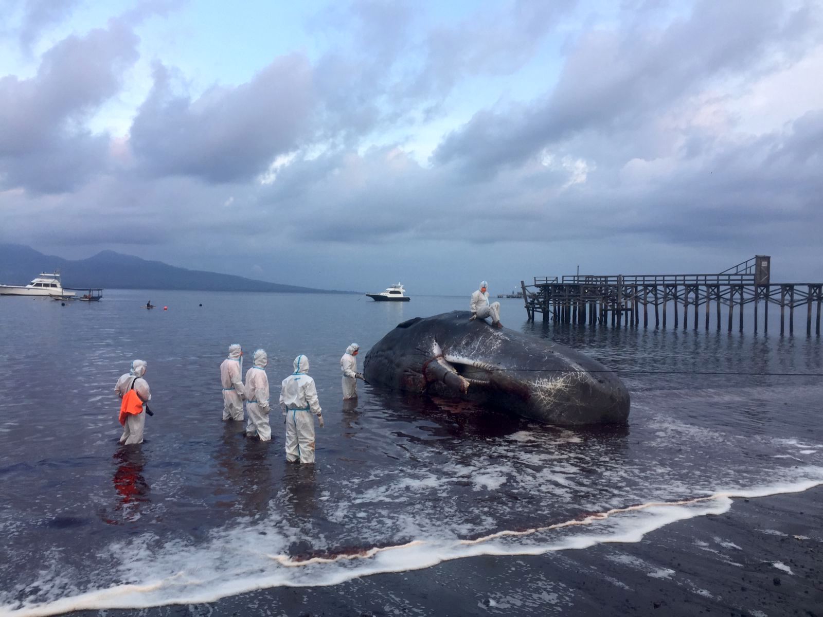 - Tim dokter hewan sudah mengambil sampel dan merencanakan pemeriksaan lanjutan untuk mengidentifikasi penyebab terdamparnya paus sperma itu.