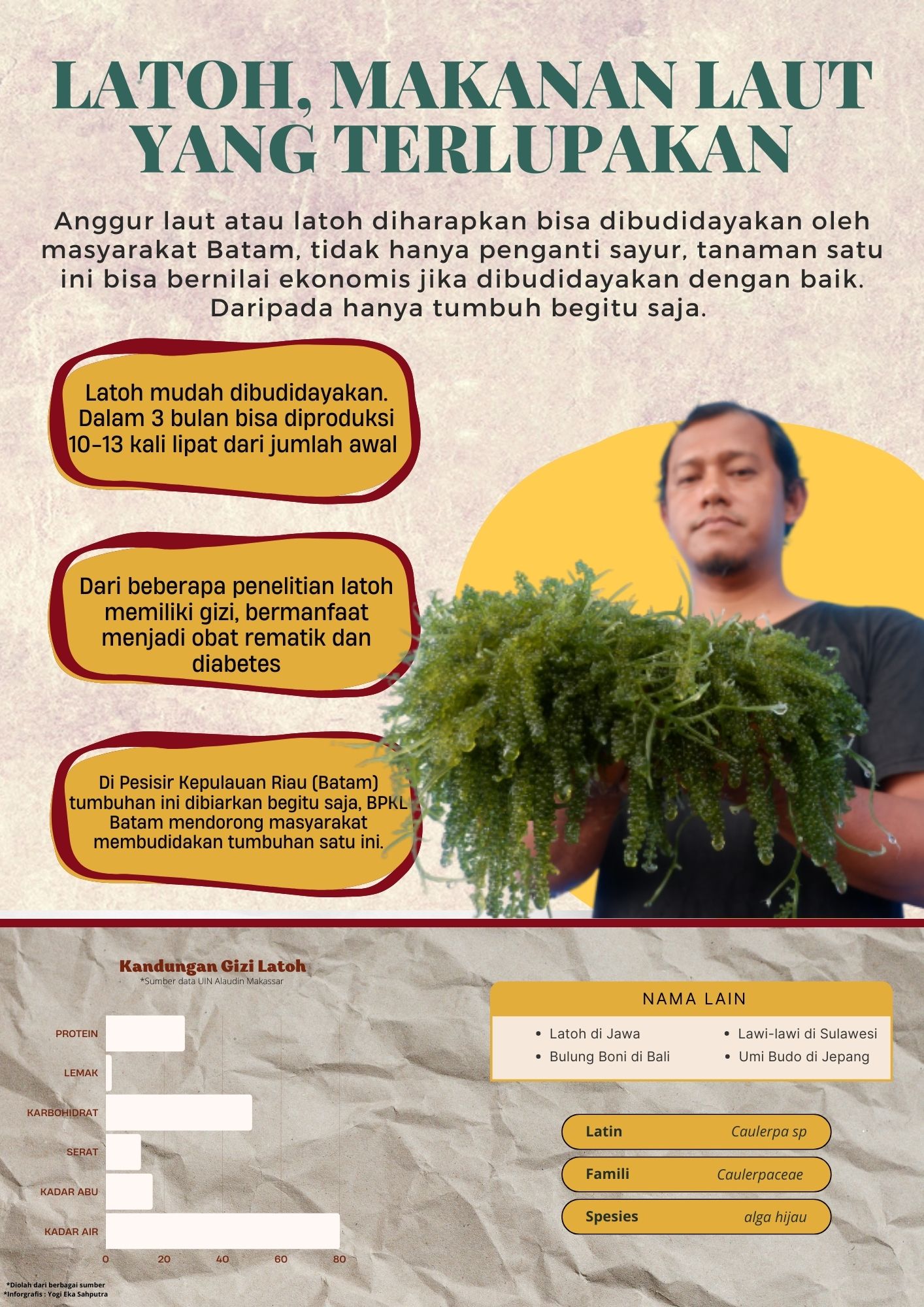 - Banyak dari masyarakat Kota Batam, Provinsi Kepulauan Riau tidak mengetahui laut mereka memiliki latoh atau anggur laut yaitu bahan makanan yang bisa dikonsumsi.