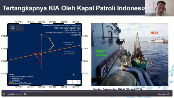 Imam juga menunjukkan data satelit dan video dokumentasi proses penangkapan KIA Vietnam oleh TNI AL pada 19 Juni 2022. Terlihat Kapal KN 268 terdeteksi melakukan shadowing terhadap KRI STS-376 ketika melakukan upaya penangkapan kepada KIA Vietnam BV5119TS. Operasi kapal VRFS dinilai IOJI sebagai tindakan escorting/pengawalan dan perlindungan terhadap aktivitas illegal fishing KIA Vietnam di wilayah ZEE Indonesia non-sengketa.
