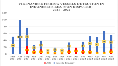 Jumlah terbanyak KIA Vietnam yang diduga melakukan illegal fishing di Laut Natuna Utara (LNU) pada bulan Mei 2022, yaitu 60 kapal. Kapal-kapal ikan Vietnam tersebut paling sering beroperasi di Laut Natuna Utara ZEE Indonesia non-sengketa, pada koordinat 106.2 BT hingga 109.1 BT dan 5.3 LU hingga 6.2 LU.