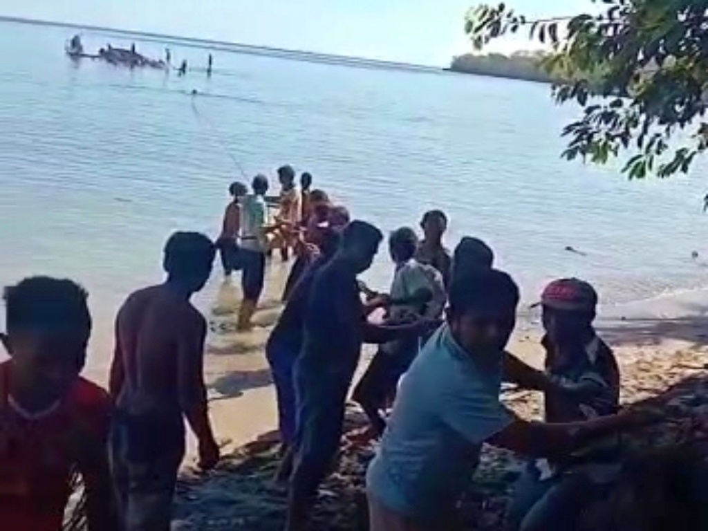 Setelah ditemukan, warga pesisir pantai Desa Bagang menarik bangkai paus biru tersebut ke pinggir pantai.