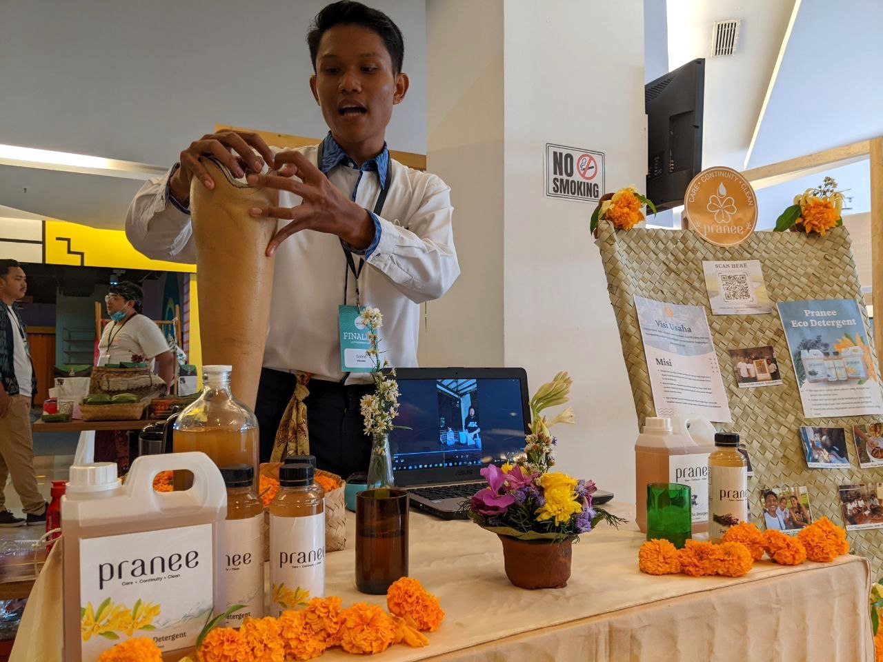 Satria, pengembang Pranee terlihat antusias menjelaskan produknya. Ia mengajak mencium aroma deterjen yang dioleh dari kombinasi ecoenzym dan surfaktan minyak kelapa sawit dan bahan sintetik yang diklaim tidak mencemari lingkungan.