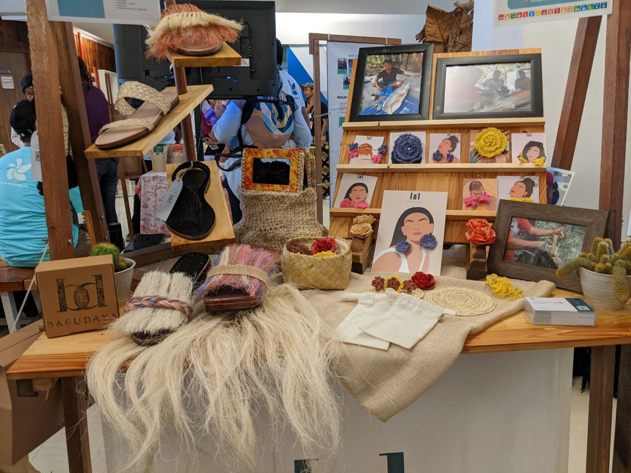 Di meja lain, pengembang Bagudaya menunjukkan aneka hasil olahan serat sisal (Agave sisalana) dan warga lokal menyebut gebang. Tanaman ini tumbuh di kaki dan lereng Gunung Agung, Kabupaten Karangasem, diyakini menjaga tanah dari erosi dan mampu menyerap karbondioksida dengan baik. Bagudaya memamerkan olahan serat ini melalui bros, anting-anting, sandal, dan lainnya.
