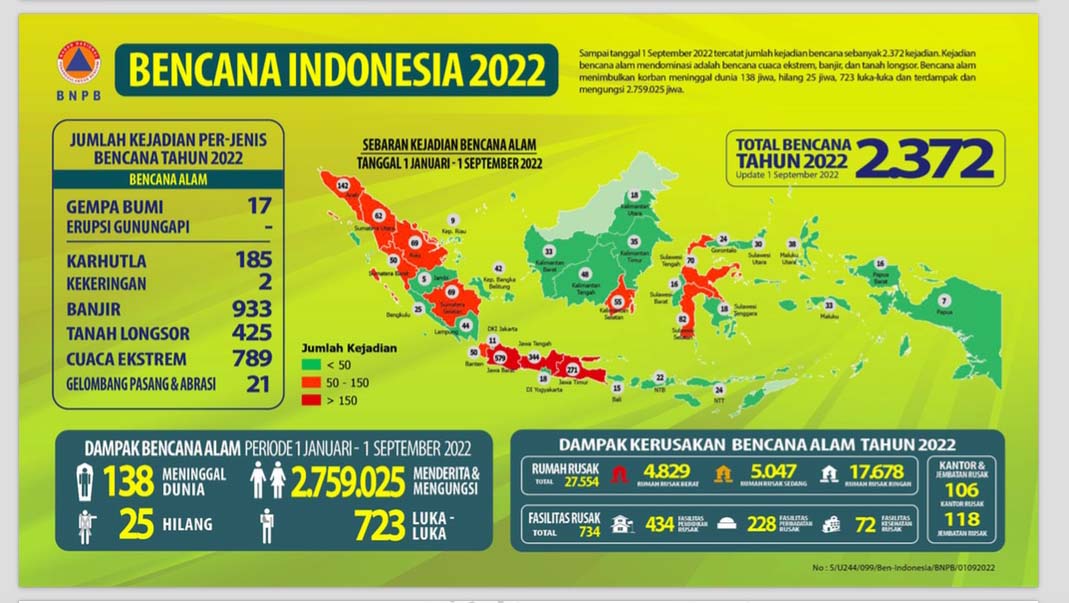 Dwikorita Karnawati, Kepala BMKG konferensi pers virtual akhir Agustus lalu mengatakan, La-nina akan bertahan hingga akhir 2022. Sebagian wilayah di Indonesia akan mengalami musim hujan lebih awal. Sebelumnya, pada Februari lalu, BMKG menyebut musim kemarau 2022 datang lebih lambat dari normal di 163 zona musim (zom).