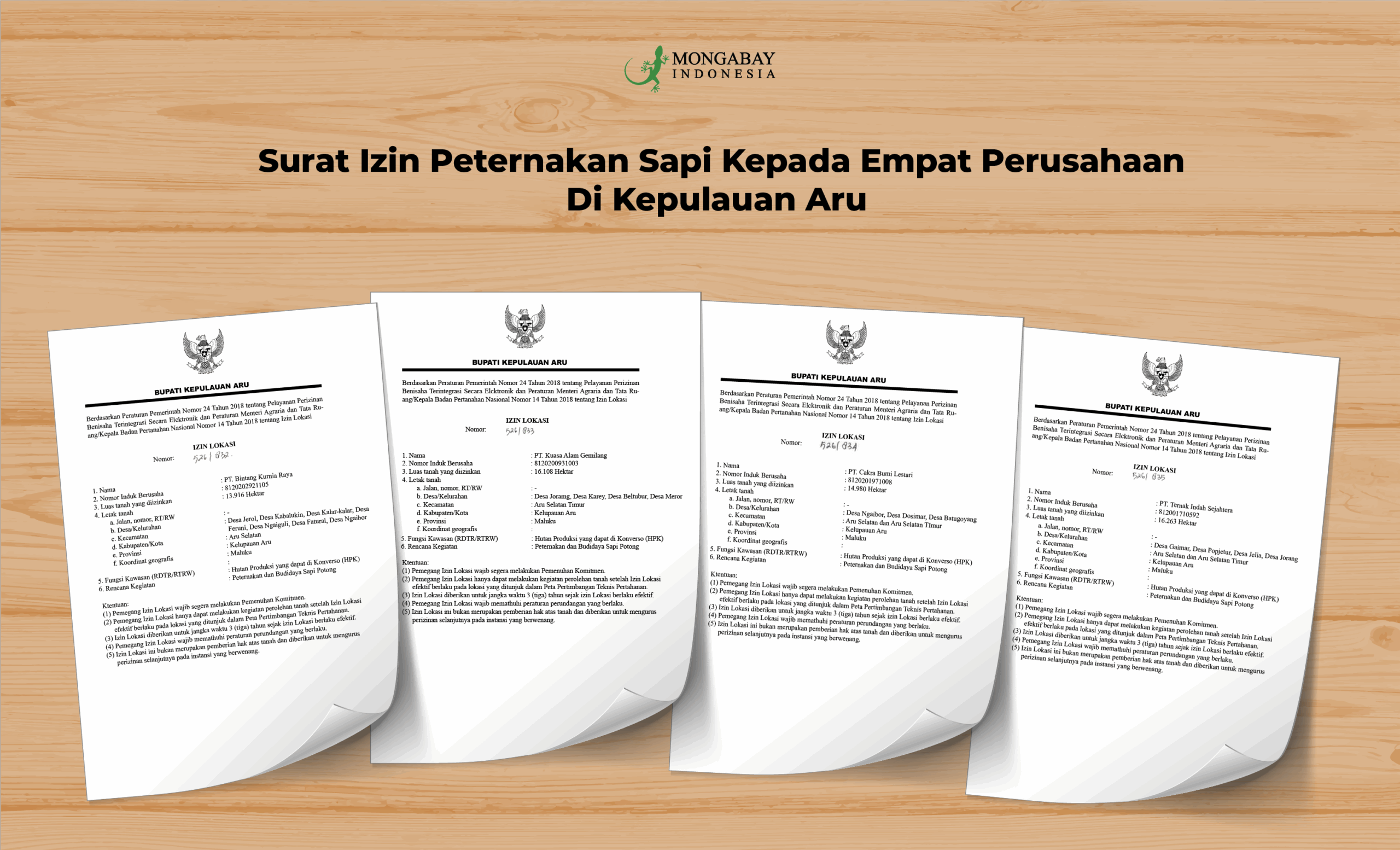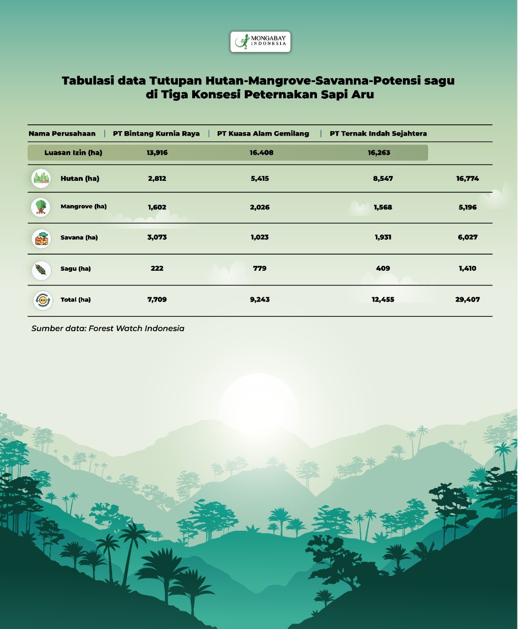 Dari izin ketiga perusahaan ini, 16.649,18 hektar berada di hutan alam, savanna 6.860, 78 hektar, hutan mangrove 5.166,02 hektar dan dusun sagu 1.410,13 hektar.