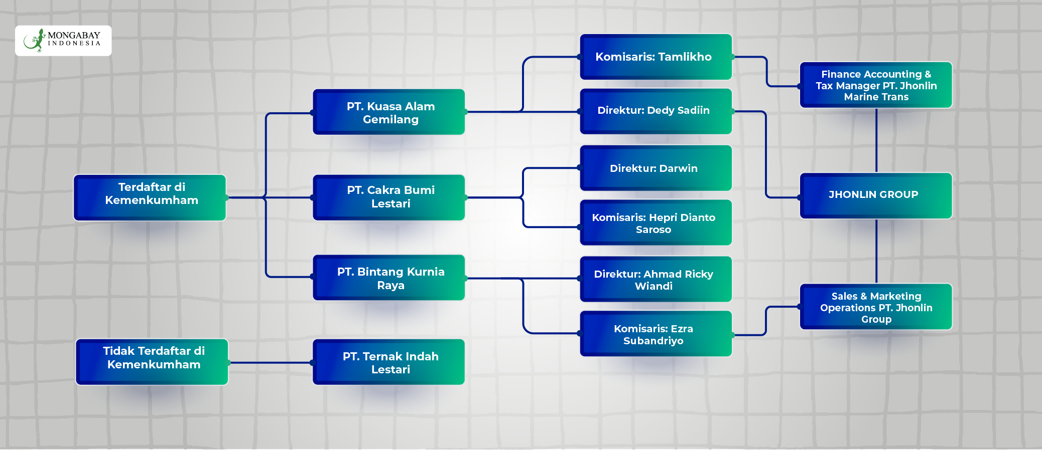 Izin-izin peternakan sapi bagi empat perusahaan ini, dari penelusuran FWI terkait dengan Jhonlin Group, perusahaan milik Andi Syamsuddin Arsyad, atau lebih dikenal sebagai Haji Isam.