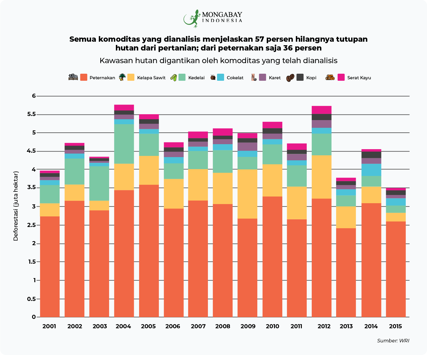 Dari analisis terbaru WRI ini memperlihatkan tujuh komoditas agrikultur seperti peternakan, sawit, kedelai, kakao, karet dan perkebunan kayu menyebabkan kehilangan 26% atau sekitar 71,9 juta hektar tutupan pohon dunia dari 2001-2015. Dari berbagai komoditas itu, peternakan sebagai penyumbang kehilangan hutan tertinggi, disusul sawit, kedelai, kakao, kebun karet, kopi, dan perkebunan kayu.