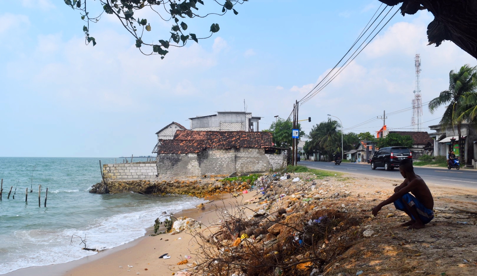 Alih-alih bermain sepak bola. Hempasan ombak itu terus menepi, menenggelamkan hamparan pasir putih yang dulunya menjadi area bermain anak-anak hingga mendekati Jalur Pantura. Dengan badan jalan beraspal pun, jaraknya kini tinggal sekitar dua meter.