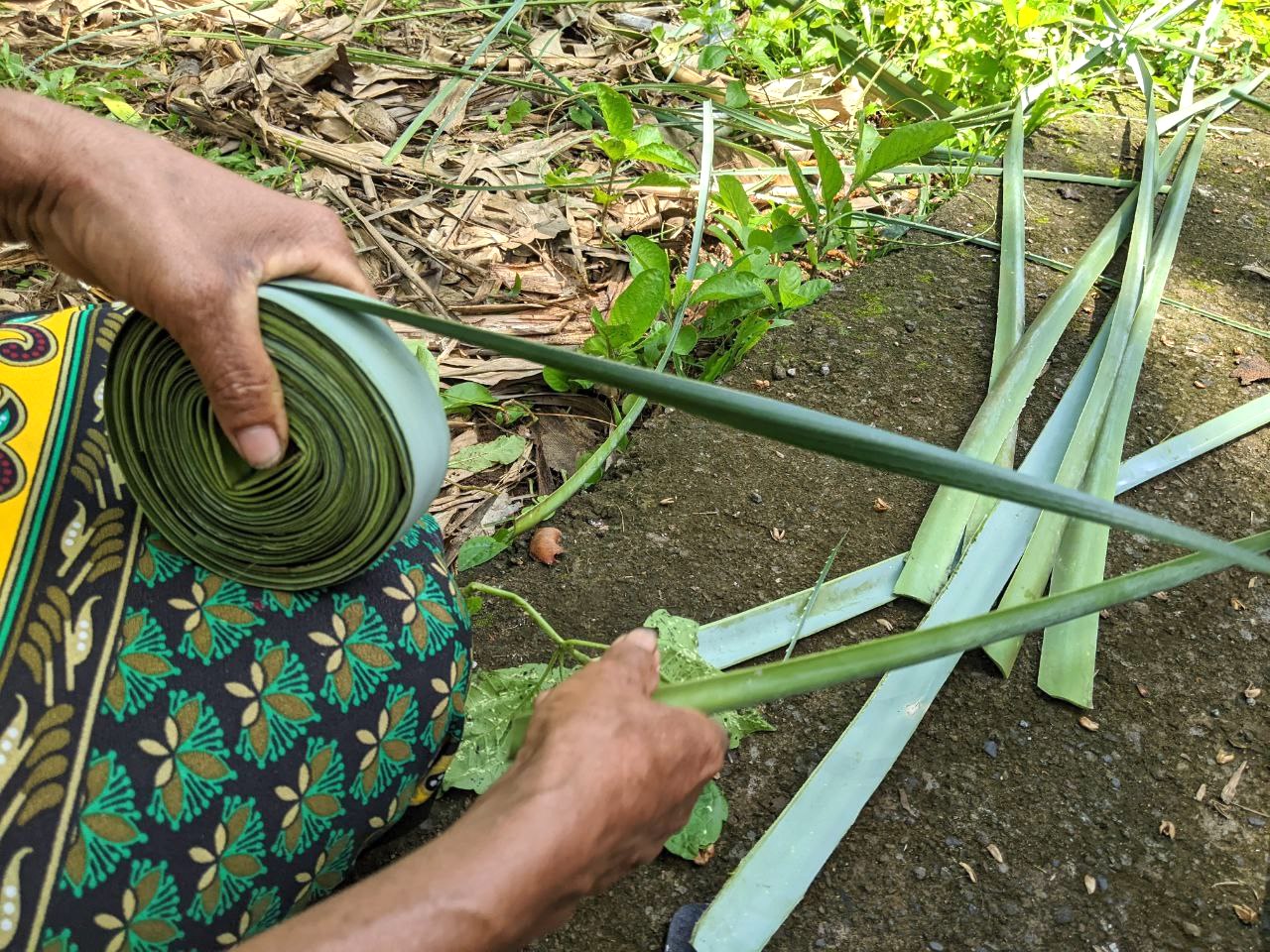 Ia menyebut jenis pandan yang dipakai adalah pandan aon atau pandan pantai. Dusun ini dekat pesisir. Perdu Pandanaceae, salah satu suku anggota tumbuhan berbunga ini hidup di bahu bukit dan pinggir jalan desa. Pohon dengan akar tunjang di pangkal batangnya ini juga tumbuh subur di lahan kritis seperti jurang dan tebing. Akarnya yang kuat mencengkeram tanah membantu area sekitarnya dari erosi. Namun pandan ini lebih subur jika ditanam di area terbuka dengan sinar matahari langsung.