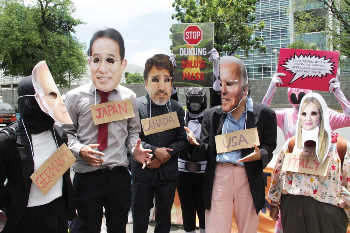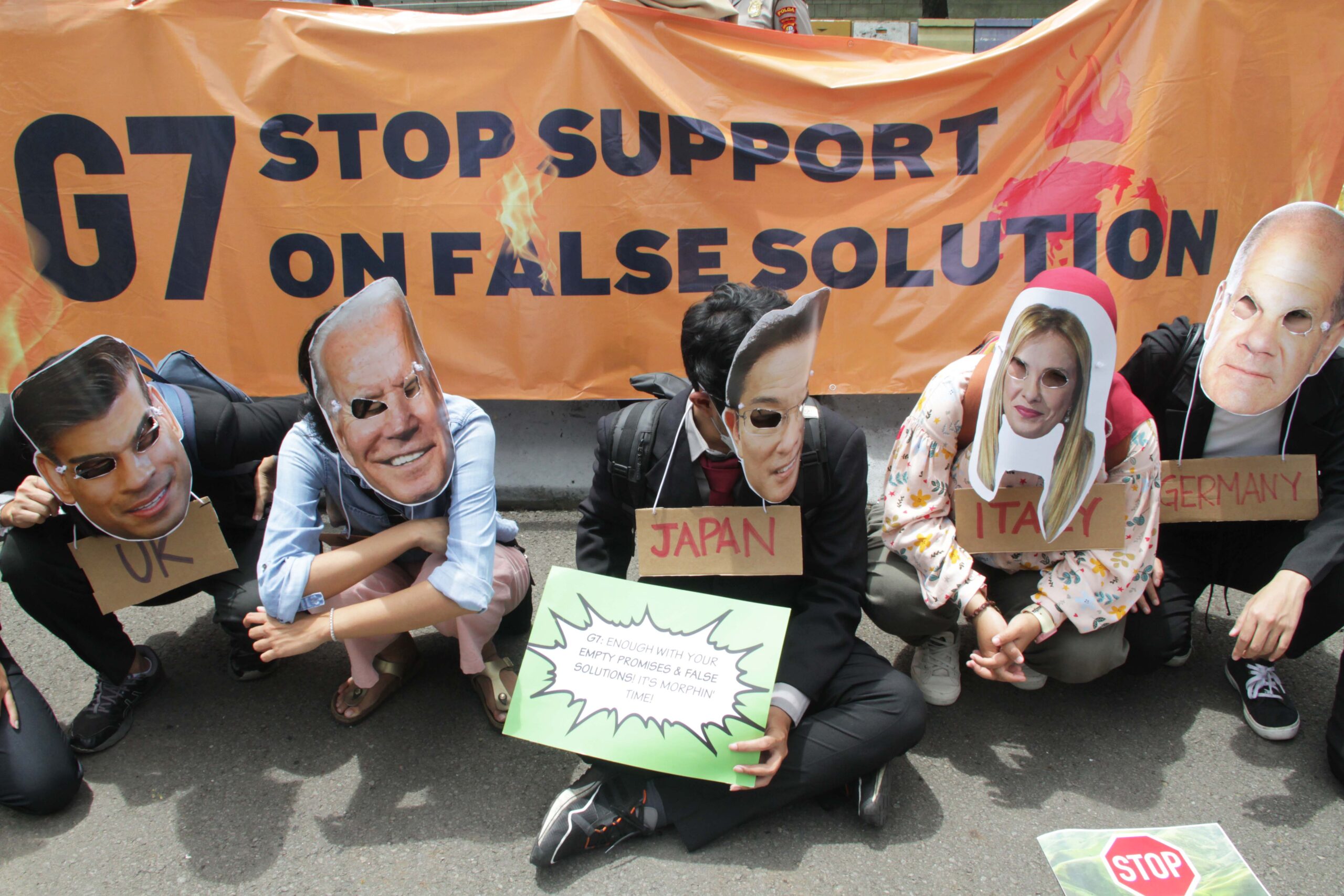 “G7 Stop Support on False Solution.” Antara lain bunyi spanduk yang mereka bawa di Kedutaan Besar Jepang dan Amerika Serikat. G7 adalah kelompok negara yang terdiri dari Kanada, Prancis, Amerika Serikat, Inggris, Jerman, Jepang dan Italia. Negara-negara besar ini nanti juga jadi bagian dalam pertemuan G20 di Bali, November ini.