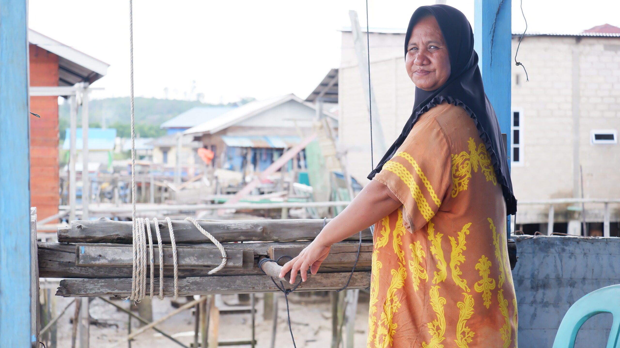 Jaring diangkat menggunakan tuas yang terdapat di pelantar. Istri Syarifuddin, Encik Tang bertugas memutar tuas yang membuat secara perlahan menarik jaring ke atas permukaan. “Ini namanya jaring tangkul,” kata Becek Tang wanita asal Bugis itu kepada Mongabay Indonesia sambil memutar tuas berbentuk gerigi yang dipasang dipelanta rumahnya.