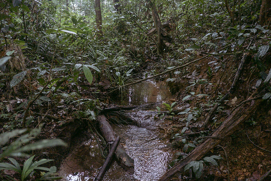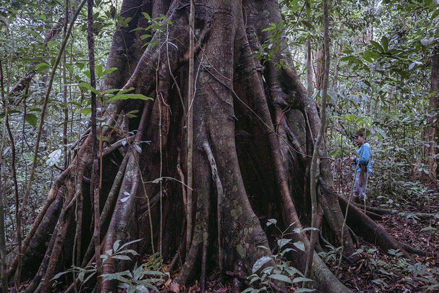 “Yang paling besar itu pohon batu [Rhodamnia sp], lingkar batangnya mencapai empat pelukan orang dewasa. Ada juga pohon nyatoh [Palaquium rostratum], medang [Lauraceae sp], melangir [Shorea balangeran], serta banyak pohon ara [Ficus annulata], akarnya terlihat menyeramkan,” kata Iswarjono [39], lelaki yang menemani saya menelusuri Rimba Mambang, Kamis [17/11/2022].