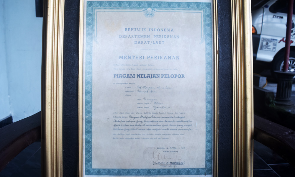 Mongabay yang berkunjung ke kediaman kerabat Mbah Moedjair berkesempatan melihat salinan penghargaan itu. Tertulis, “Bahwa kami Menteri Pertanian atas nama Pemerintah Republik Indonesia memberi surat tanda djasa kepada Sdr. Moedjair, tempat tinggal Desa Papungan, Kabupaten Blitar, Jawa Timur, sebagai penghargaan menemukan suatu djenis ikan jang diberi nama ikan mudjair, yang ternjata memberi manfaat besar bagi masyarakat Indonesia,” tulis piagam itu.