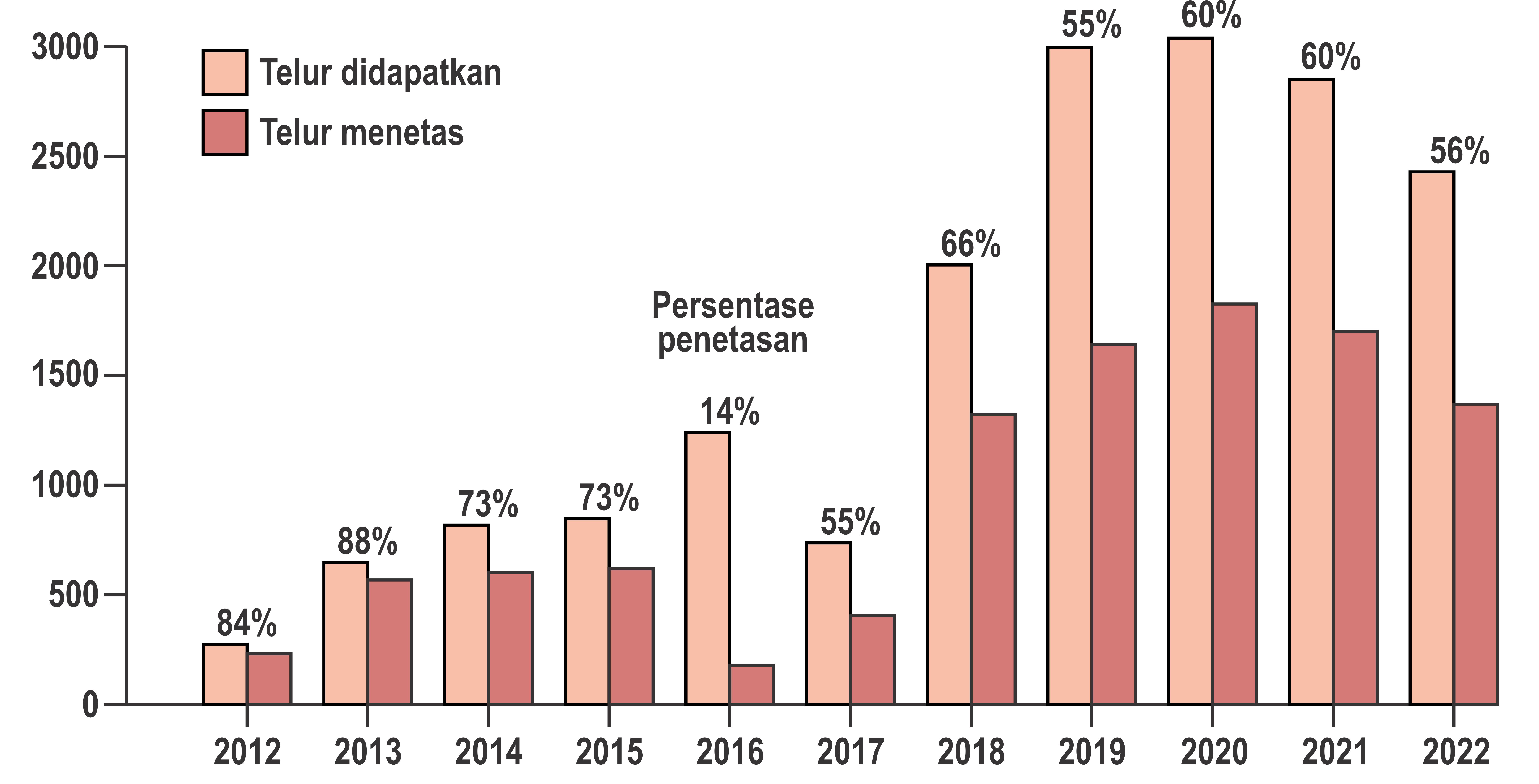Namun, jika melihat tren dari tahun 2012, terdapat peningkatan signifikan dari telur yang berhasil diselamatkan dan tukik yang menetas. Jumlah tahun ini bertambah empat kali lipat dibandingkan dengan sepuluh tahun sebelumnya.