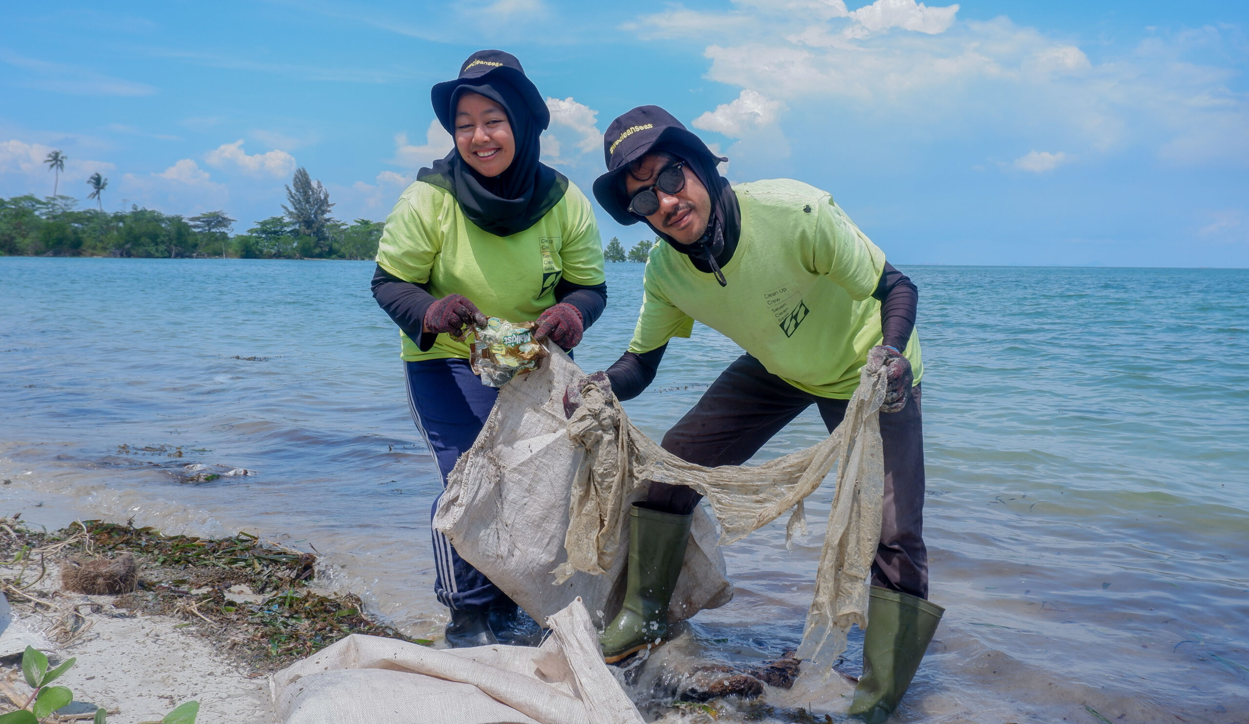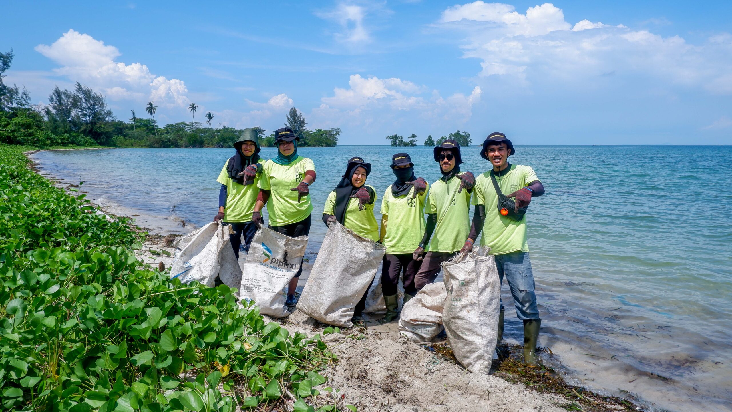 Disepanjang pantai nampak segerombolan anak muda. Mengenakan seragam baju kaos berwarna hijau terang. Lengkap dengan penutup kepala, sarung tangan, kacamata hitam dan masing-masing mereka membawa satu karung putih berukuran sedang.
