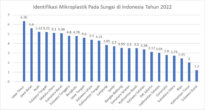 Data Tim Ekspedisi Sungai Nusantara (ESN) 2022 yang menguji kandungan mikroplastik di 68 sungai strategis nasional, menunjukkan, lima provinsi paling tinggi kontaminasi partikel mikroplastik yaitu Jawa Timur 6,36 partikel/liter, Sumatera Utara 5,20 partikel/liter, dan Sumatera Barat 5,08 partikel/liter. Kemudian, Bangka Belitung 4,97 partikel/liter, dan Sulawesi Tengah 4,17 partikel/liter.