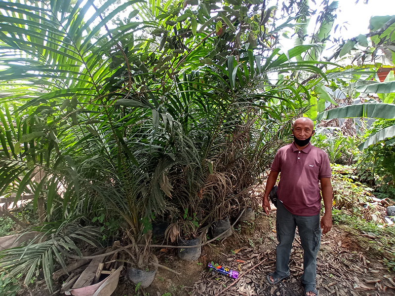 Sumaji Pandu Alam (57) menatap bibit sawit di halaman rumahnya, untuk replanting tahun depan. Ini jenis bibit marihat yang ditanam dengan jarak 9×9 meter. Tajuknya lebih kecil dibanding sawit umumnya yang bisa mencapai 7-8 meter.