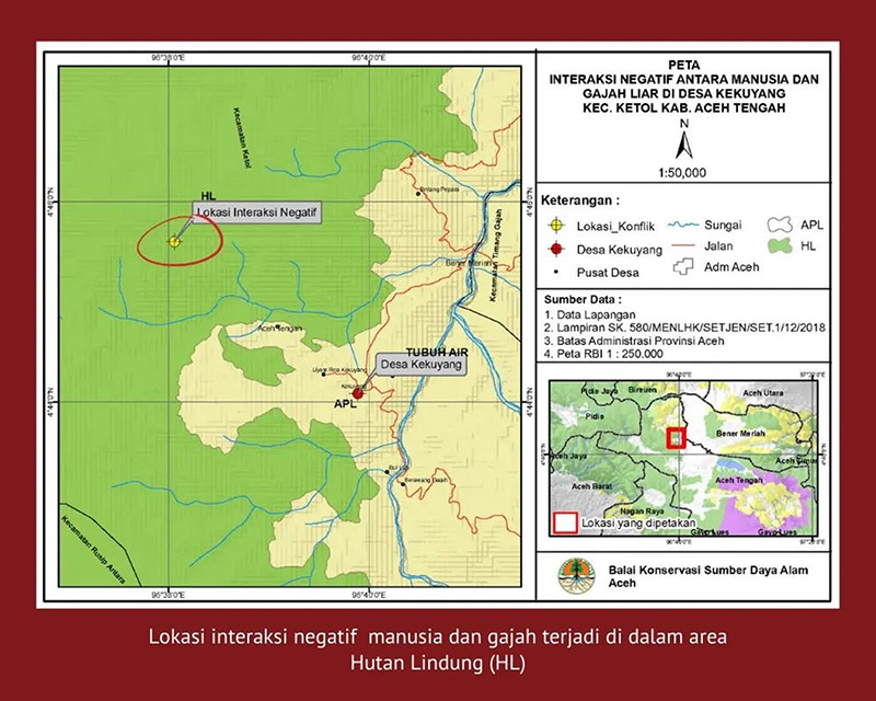 - Konflik di Kecamatan Ketol, terjadi di dalam kawasan hutan lindung. Artinya, kebun masyarakat berada di hutan lindung yang merupakan lintasan gajah.