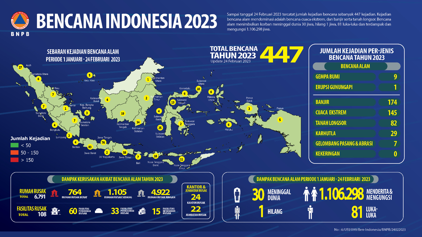 Dalam Januari-Februari 2023 ini banjir dan longsor masih melanda di berbagai daerah seperti di Sulawesi, Jawa, Nusa Tenggara, Papua, dan lain-lain. Sampai jelang penghujung Februari ini, bencana terus terjadi, seperti di Solo Raya. Hujan deras membuat Sungai Berngawan Solo meluap hingga menyebabkan lima kabupaten dan kota di Jawa Tengah, banjir bandang. Ia meliputi Kabupaten Wonogiri, Klaten, Sukoharjo, Kota Surakarta dan Karanganyar. Akhir Januari lalu, banjir bandang dan tanah longsor pun menerjang Kota Manado, Sulawesi Utara.