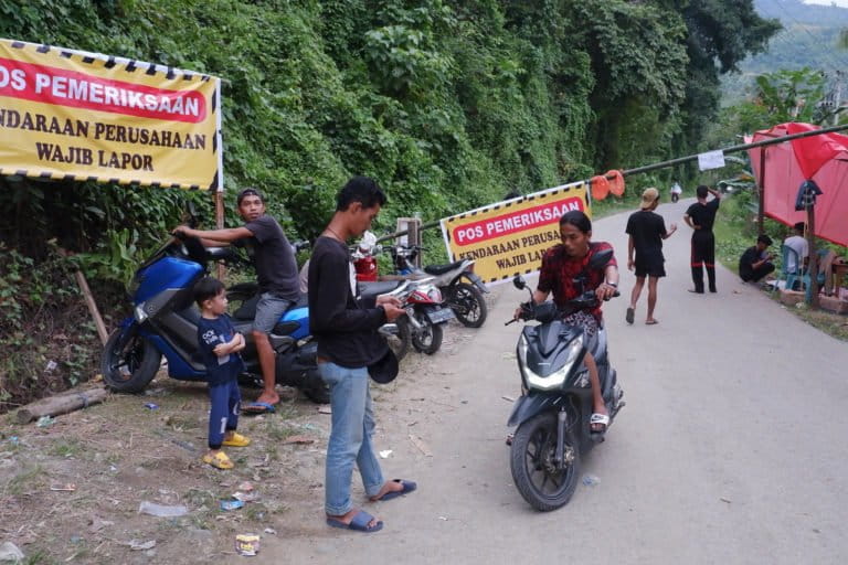 Sore itu, kendaraan terus mengeruk dan membongkar tanah. Sebuah kendaraan double cabin terlihat memindahkan solar dari tangki menggunakan selang, lalu ditampung ke jerigen dan dipindahkan ke eksavator. Dari balik tirai terpal yang dibentangkan di jalan utama desa, kami melihat praktik itu. “Ouuwww, jadi begitu,” kata salah seorang warga.