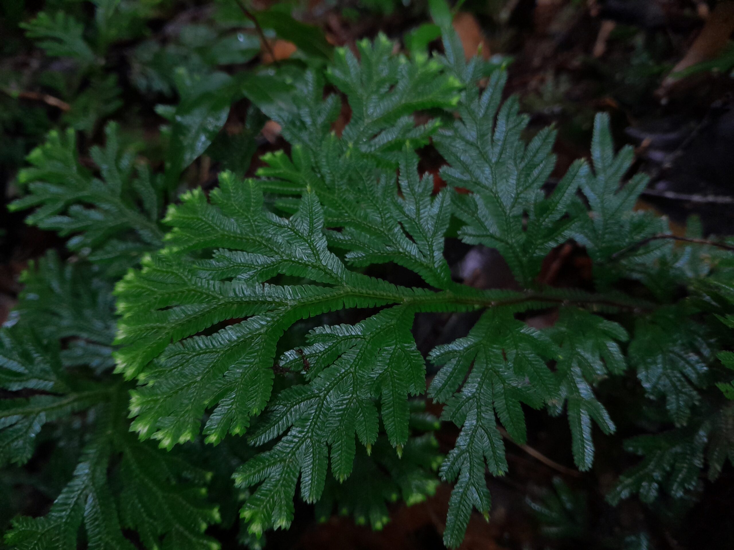 Daun-daun Selaginella intermediai (daun cakar alam) tumbuh bertumpuk di sisi jalan setapak punggung bukit penyangga Taman Nasional Kerinci Seblat (TNKS). Tumbuhan jenis paku-pakuan ini, secara turun-temurun dijadikan salah satu obat-obatan tradisional.