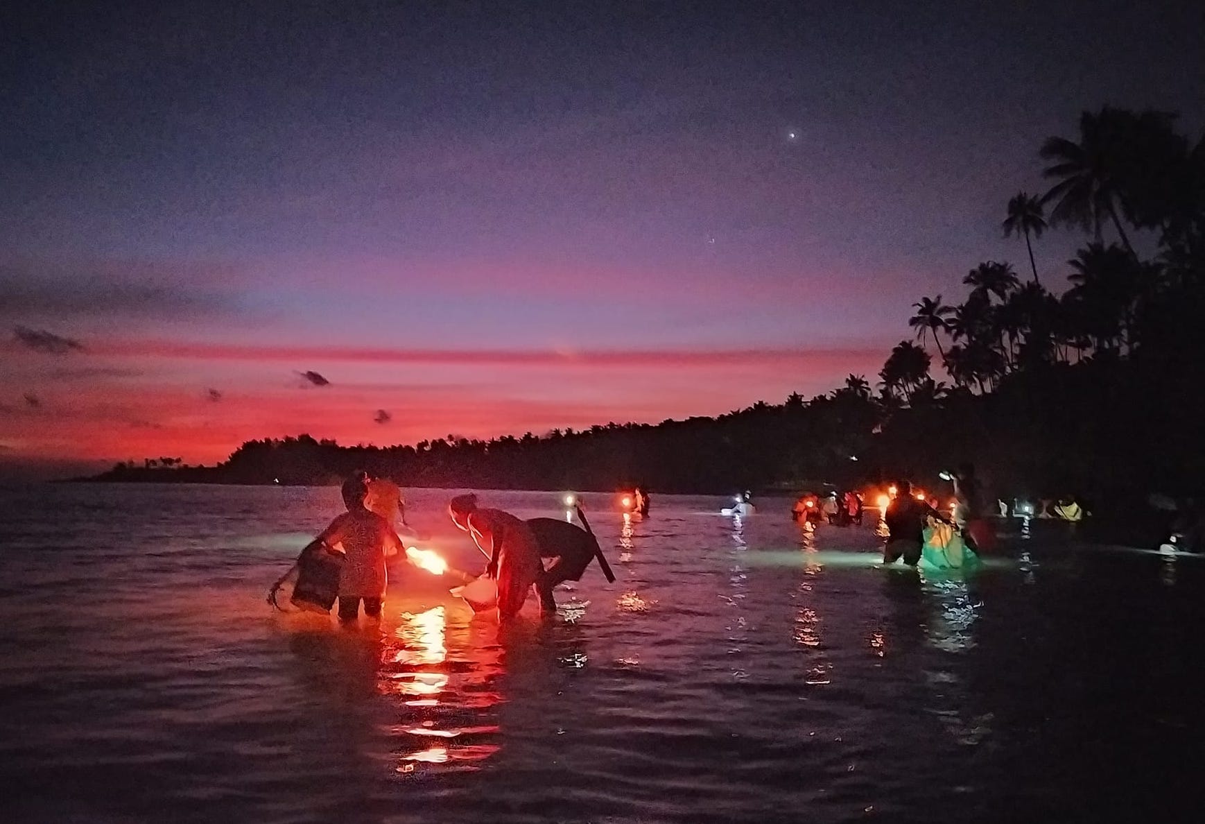 Terlihat lebih dari seratusan orang membawa perkakas alat penyaring seperti saringan dan loyang, ember, berjejer di tepi pantai dengan penerangan cahaya petromak dan obor membuat semarak pesisir laut yang sedang surut atau meti.