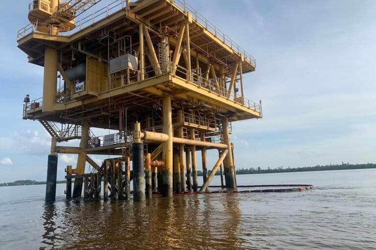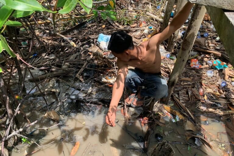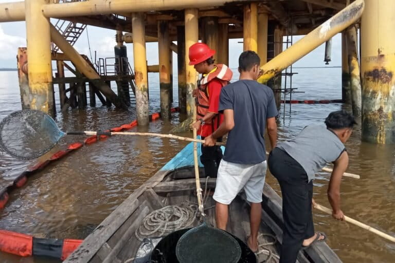 Berdasarkan video yang dibagikan seorang warga ke Mongabay, tampak serpihan bintik hitam di perairan Sungai Apit, terutama Kampung Bunsur. Limbah itu juga mengapung hingga ke sela-sela hutan mangrove sampai pinggirian tebing, benteng daratan penduduk penahan ombak. Tim perusahaan menyaring limbah itu dari perahu dengan tangguk ikan.