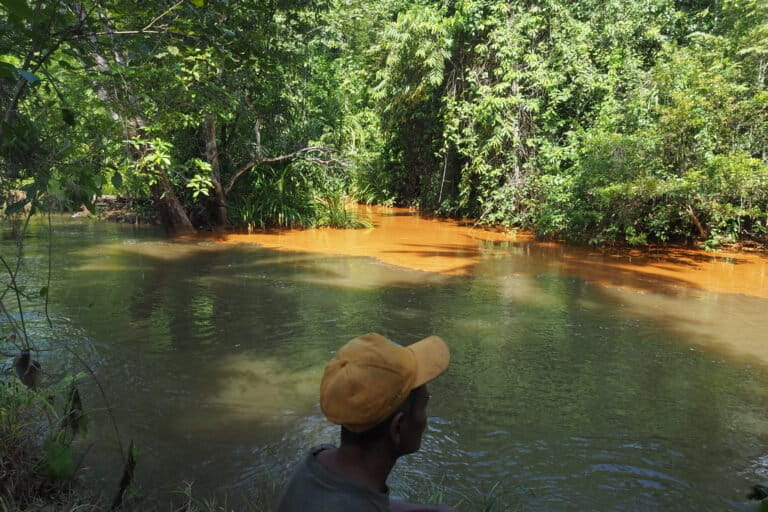 Di titik pertemuan dua sungai di sekitar Desa Dompu-dompu, salah satu sungai terlihat membawa lumpur coklat, mencemari aliran sungai berbeda jadi agak keruh. Air pertemuan dua anak sungai ini mengalir ke muara dengan warna orange. Laut sepanjang pesisir Pantai Wawonii Tenggara, berubah warna.