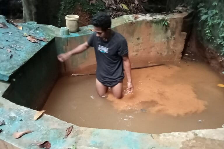 “(Air) sudah tidak bisa lagi digunakan,” kata warga ketika sedang gotong royong mengeluarkan lumpur dari lantai bak yang mengendap setinggi betis orang dewasa.