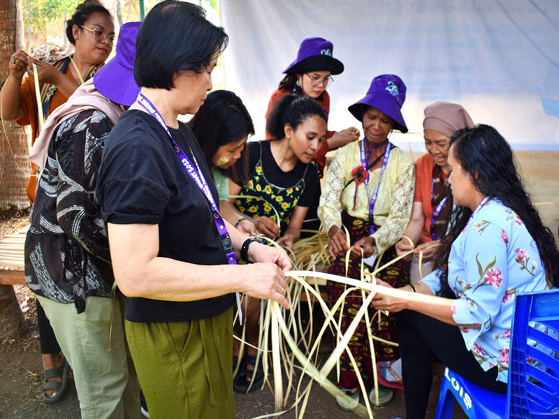 Mama Eta diundang memberikan pelatihan menganyam kepada peserta pertemuan Southeast Asia – Women Environmental Human Rights Defender Summit 2023 [WEHRDs] 2023. Pertemuan yang dihadiri perwakilan enam negara itu [Indonesia, Kamboja, Laos, Myanmar, Filipina, dan Thailand], berlangsung di Waiotan Farm, Desa Pajinian, Kecamatan Adonara Barat, Kabupaten Flores Timur, Provinsi Nusa Tenggara Timur [NTT], pada 20 sampai 26 Mei 2023.