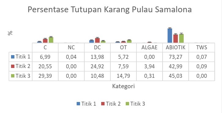 Sementara persentase tutupan karang pada titik 3 sebesar 29,39% masuk dalam kategori sedang. Dalam acuan Kepmen LH No.4 Tahun 2001 sendiri dikatakan bahwa kondisi karang tergolong sedang apabila nilainya berkisar antara 25% – 49,9%.