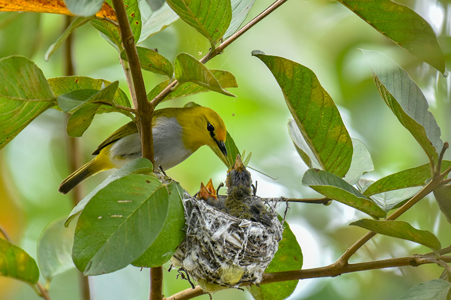 Ketika periode mengeram selesai dan telur menetas, pasangan burung ini akan bergantian memberi pakan kepada anak-anak mereka sembari waspada dengan predator sekitar. Pakan berupa biji-bijian, larva ulat, ataupun serangga kecil.
