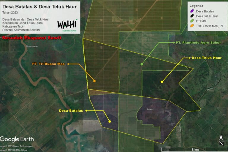 Berdasar pantauan Walhi Kalsel melalui Google Citra Satelit, PAS punya konsesi 4.332 hektar di Desa Teluk Haur, dan 2.896 hektar di Desa Betalas. Sedang konsesi TBM 2.256 hektar di Desa Teluk Haur dan 141 hektar di Desa Betalas.