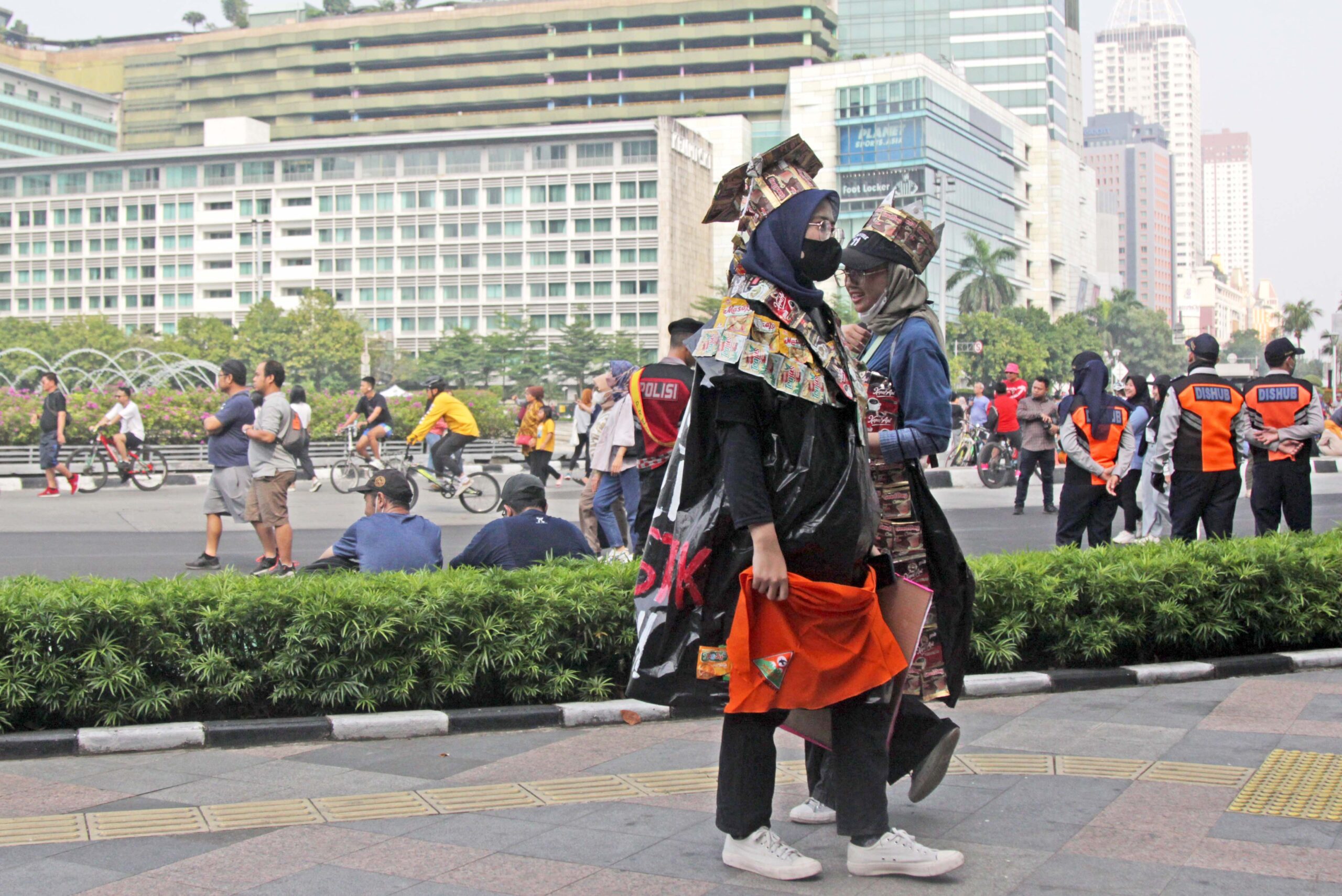 Meski berkostum dari bahan sampah plastik kemasan sachet sekali pakai, tidak membuat Nadiatul Fadilah (23) malu berjalan beriringan bersama ratusan aksi masa yang tergabung dalam kampanye kolektif pawai bebas plastik di hari bebas kendaraan bermotor atau Car Free Day di Jalan MH Thamrin, Jakarta, Minggu (30/07/2023).