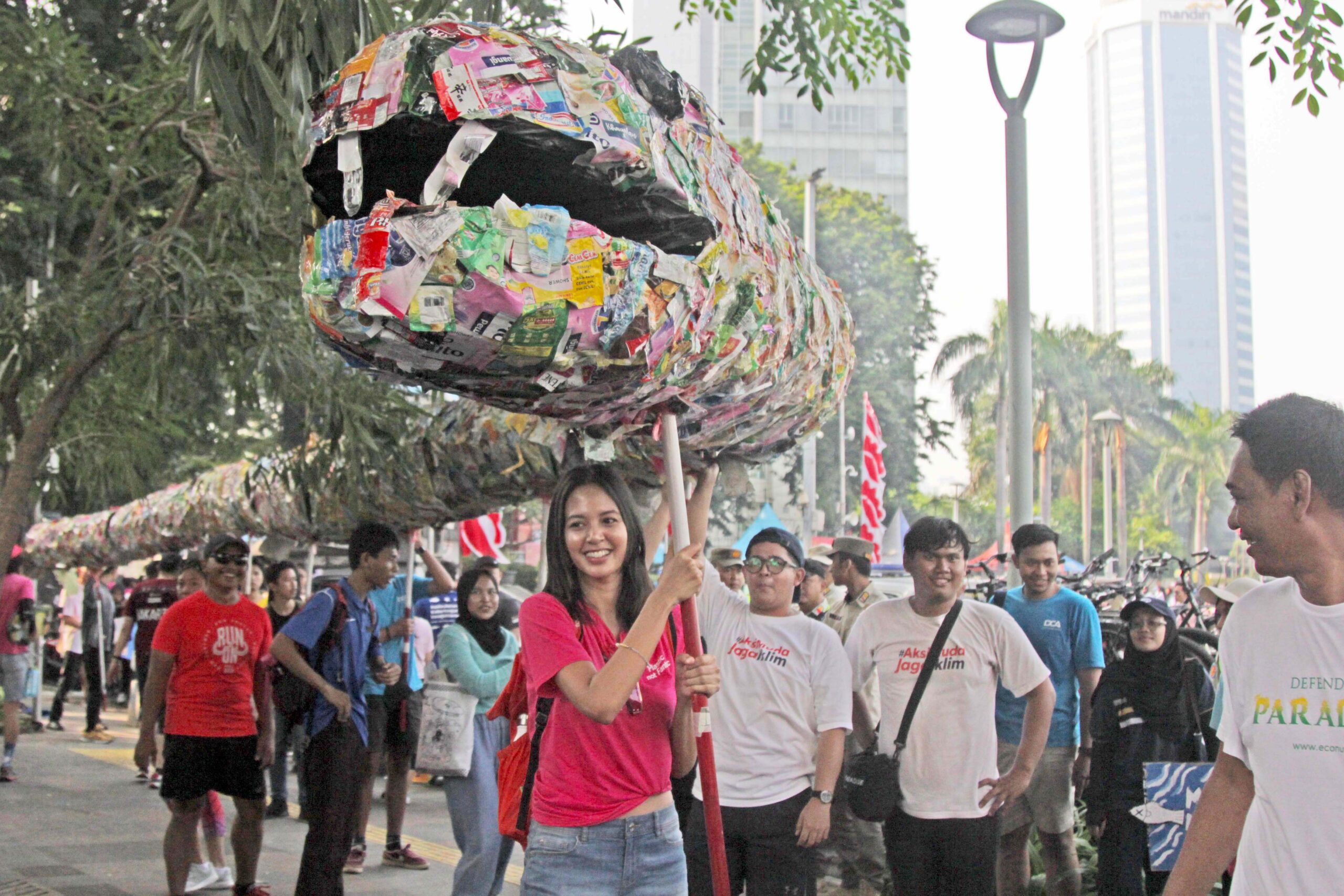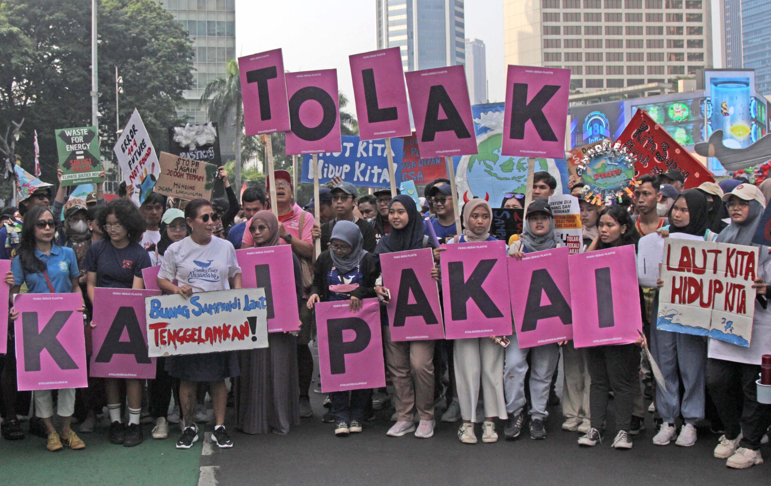 - Sejumlah aksi masa gabungan dari berbagai organisasi pegiat lingkungan melakukan kampanye kolektif pawai bebas plastik di jalan MH Thamrin, Jakarta, Minggu (30/07/2023).