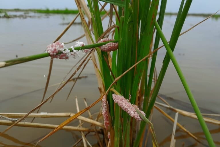 Seperti wabah, keong emas menyebar, begitu pula dengan telurnya. Satia dan Rodi sering memungut dan memusnahkan telur keong yang menempel pada pangkal batang dan daun tanaman padi.