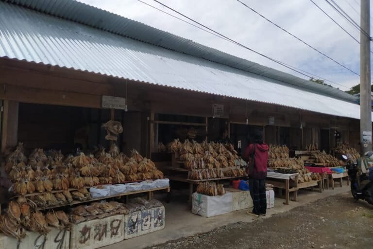 Tempatnya berada di bahu jalan dan berhadapan langsung dengan jalan masuk menuju Desa Jayabakti, Pagimana. Sepintas kalau dilihat dari jalan raya, tempat ini surga bagi penggemar ikan laut kering asin.