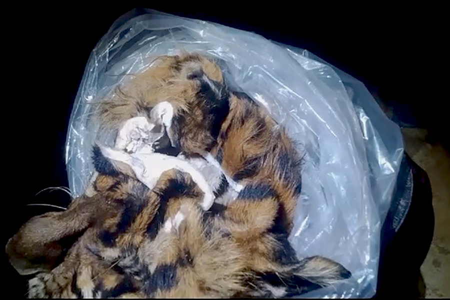 Kulitnya utuh dan masih basah. Dalam karung juga ditemukan belulang dan beberapa gigi taring.