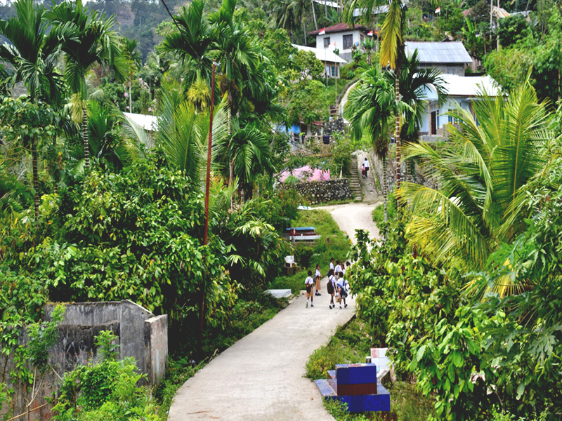 Di sisi kiri dan kanan jalan, tampak tanaman kakao, kemiri, kelapa, cengkih, dan pisang mendominasi.