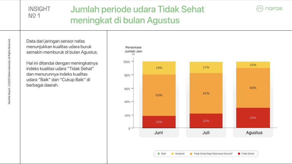 Piotr Jakubowski, Co-founder & Chief Growth Officer Nafas mengatakan, sepanjang 2023, terjadi peningkatan konsentrasi PM2,5 melebihi baseline pada Juni, Juli dan Agustus. Dalam kurun itu, keluhan penyakit pernapasan rata-rata meningkat pada Juni sebesar 34% dan 32% di Juli-Agustus.