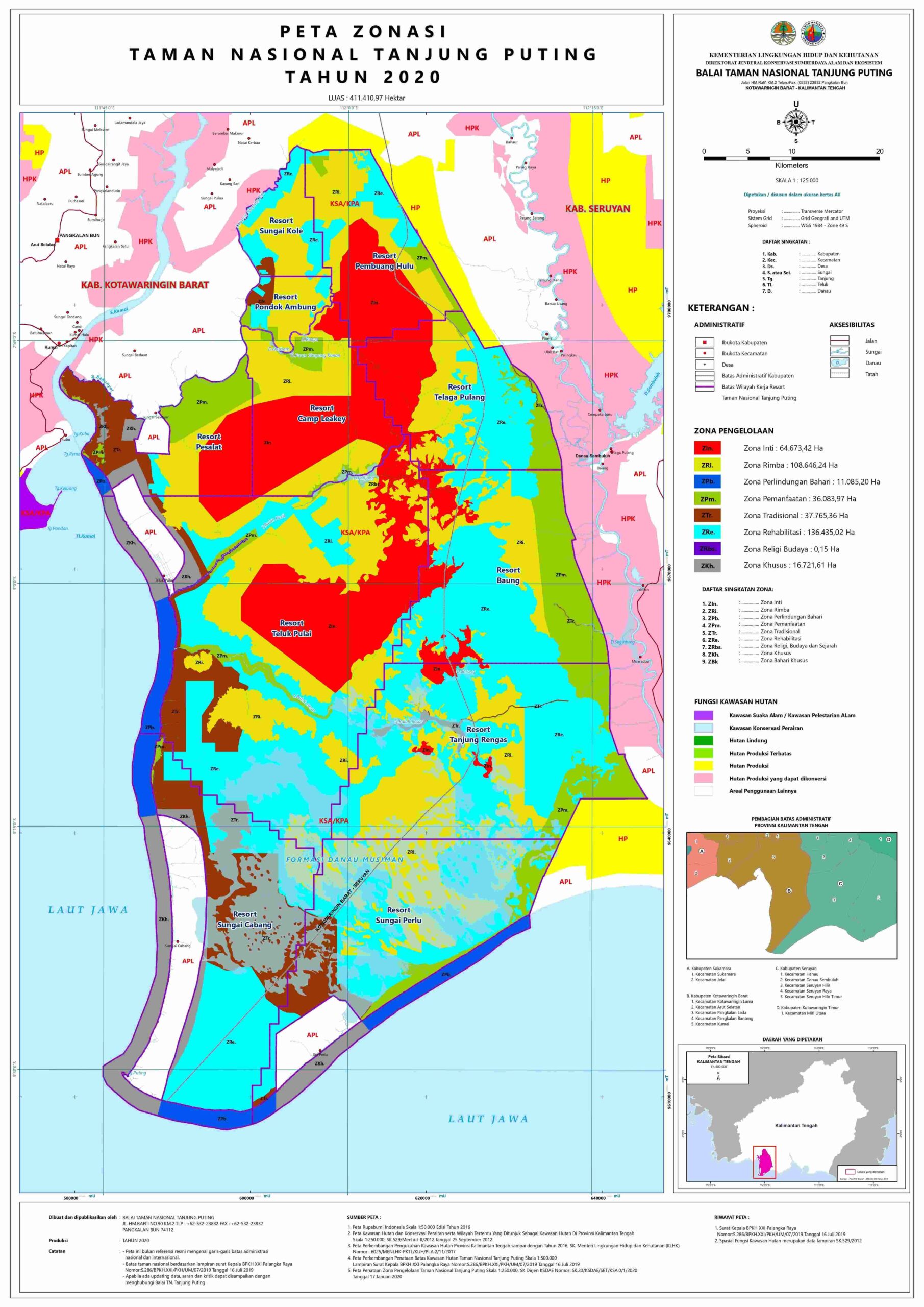 Taman Nasional Tanjung Putting, memiliki luas lebih 400.000 hektar. Secara administratif ia masuk ke dalam dua kabupaten, Kotawaringin Barat dan Seruyan. Balai TNTP mengemban banyak fungsi di kawasan ini. Tiga hal penting yang termasuk tugas dan fungsi mereka adalah melindungi dan mengamankan kawasan, mengendalikan dampak kerusakan sumber daya alam hayati, dan mengendalikan kebakaran hutan.