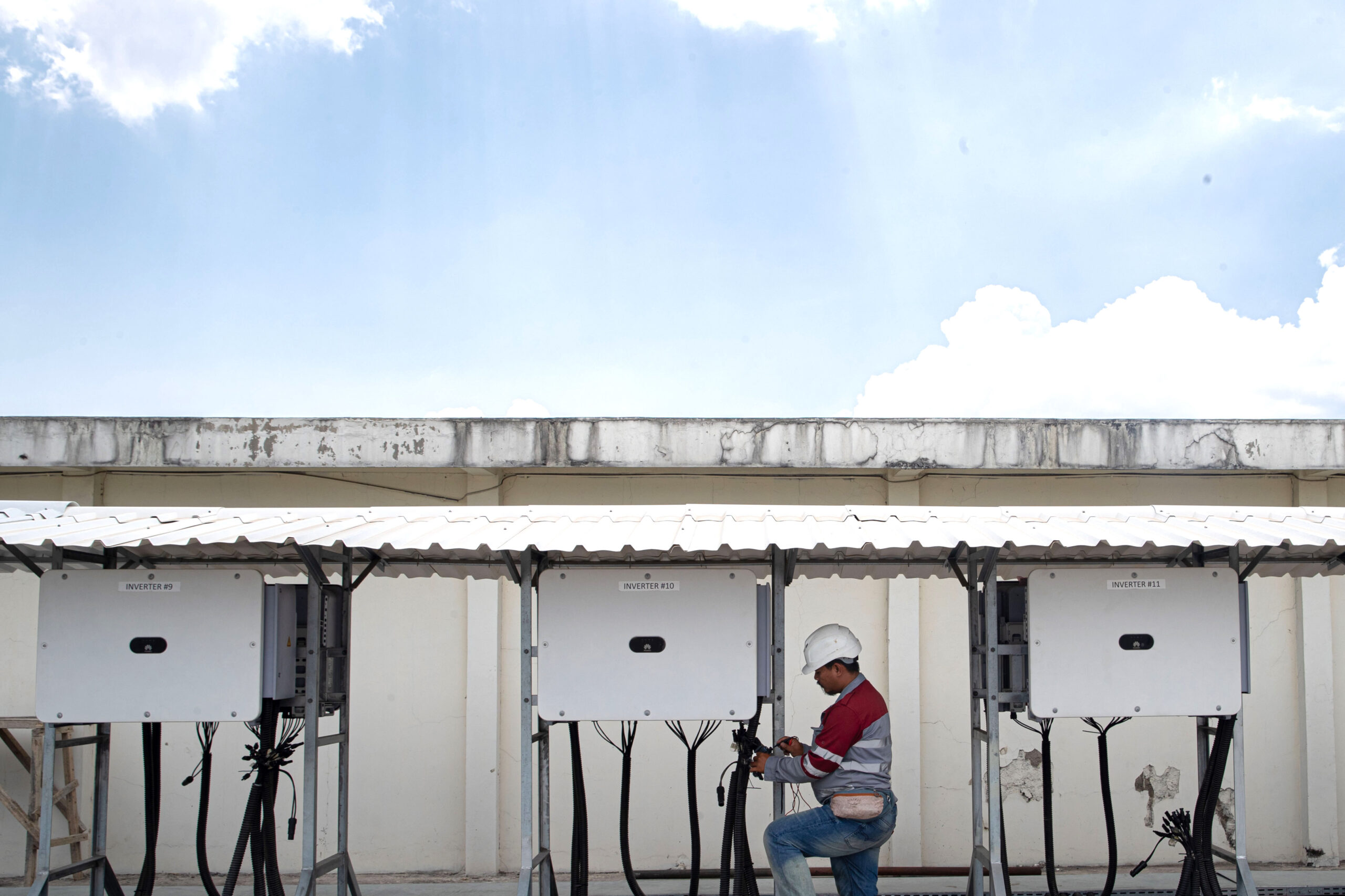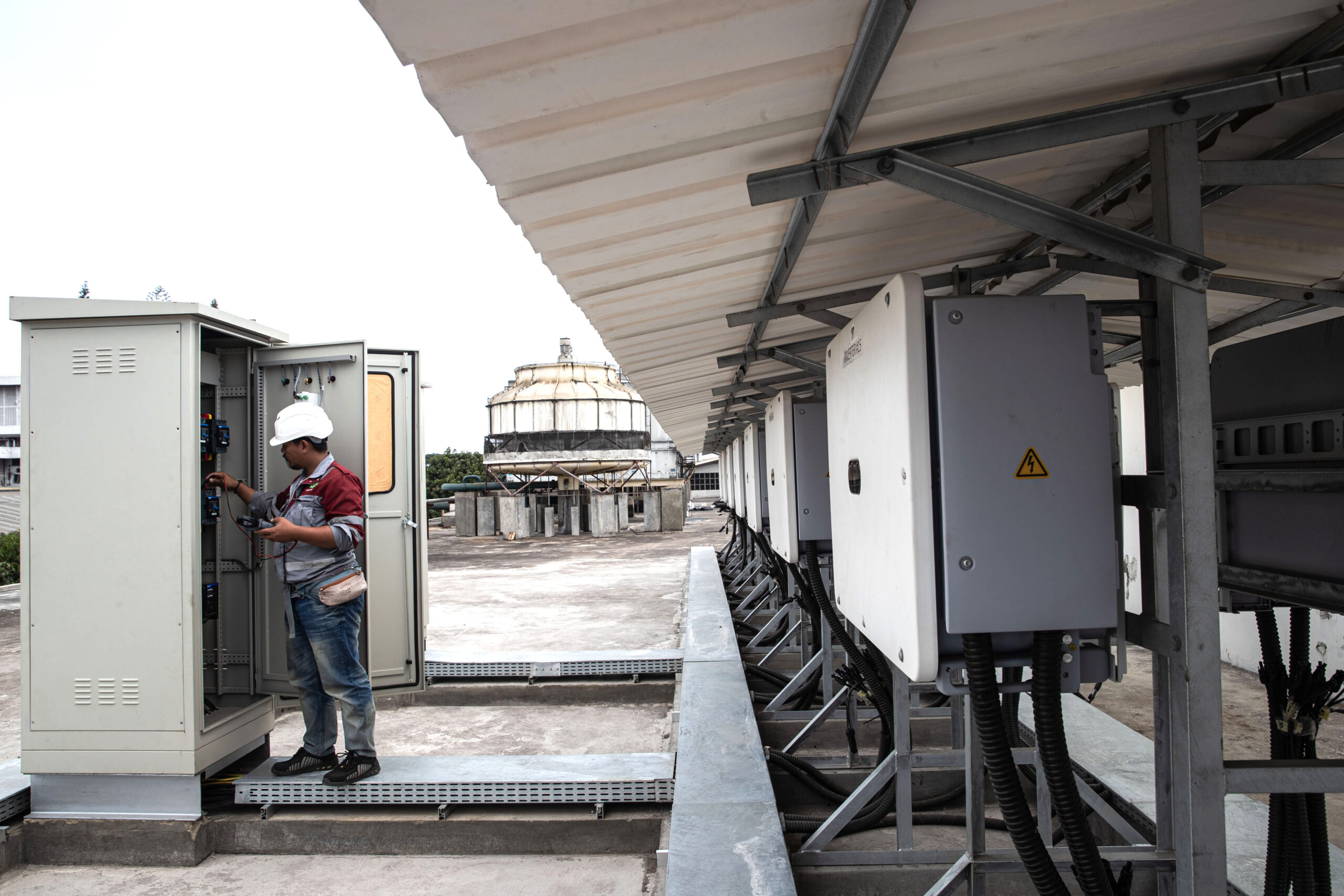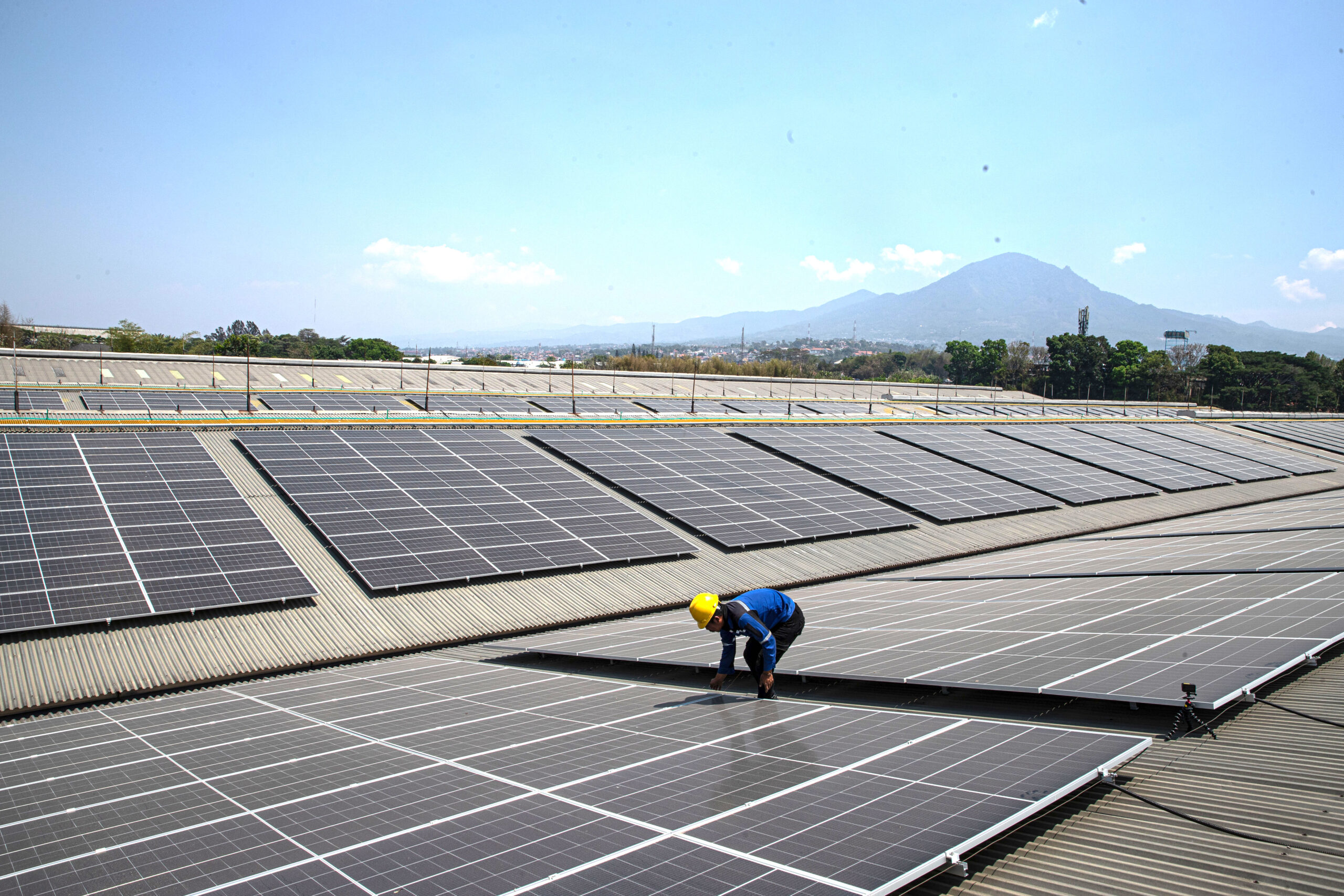 Kawasan industri di Rancaekek, Kabupaten Bandung, Jawa Barat, sedang panas-panasnya pada siang hari Jumat (6/10/2023) lalu. Saat suhu udara mencapai 340 Celsius, beberapa operator memastikan instalasi panel surya kokoh terpasang di atap pabrik.