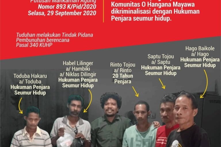Kemudian, kasus enam O’Hongana Manyawa, yakni, Hambiki, Hago, Rinto, Toduba, Awo, serta Saptu, juga dikriminalisasi atas dugaan terlibat ‘pembunuhan berencana’ dan vonis masing-masing antara seumur hidup dan 20 tahun.