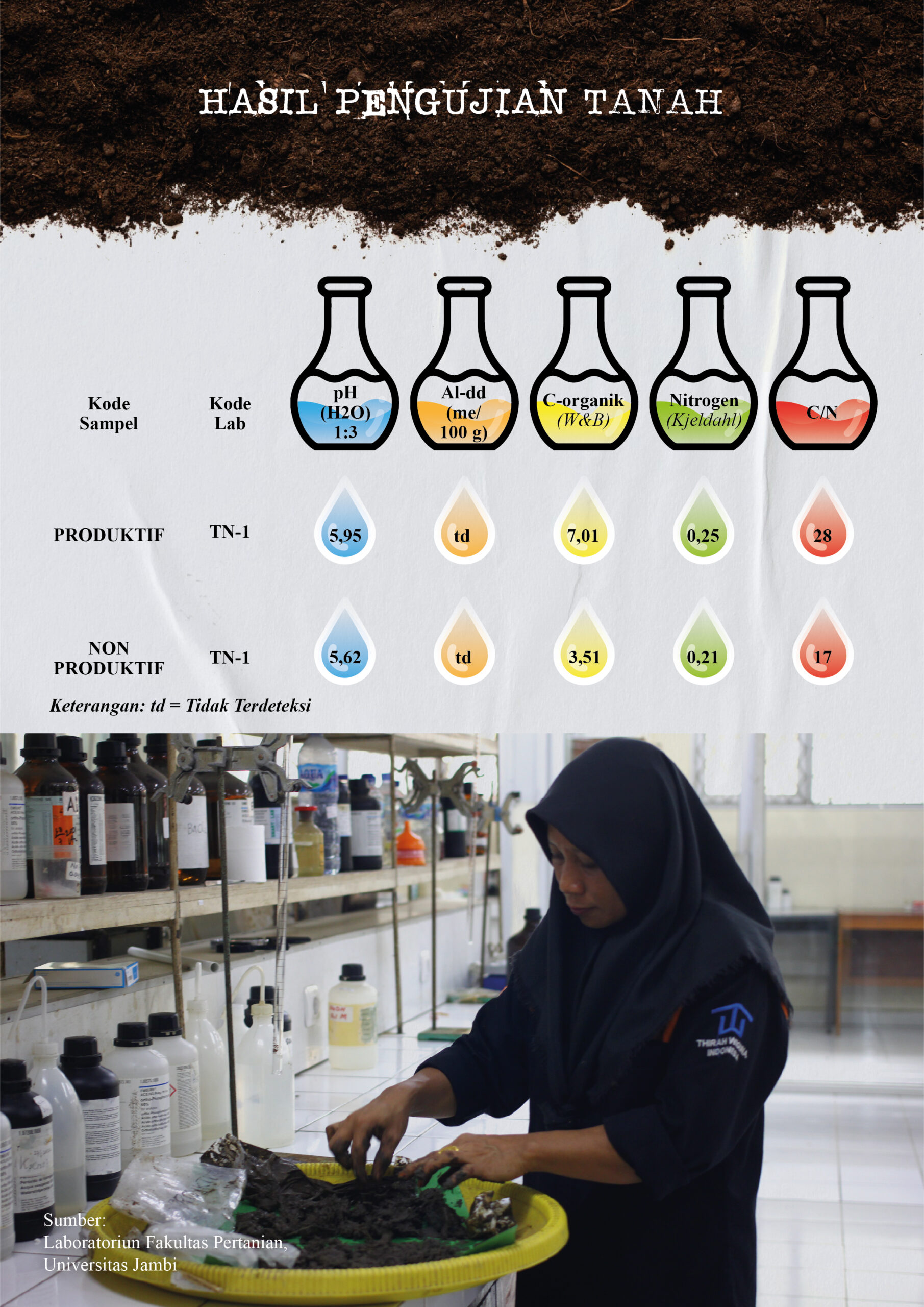 “Dari hasil lab, pH tanah, dua-duanya termasuk agak masam. C organik untuk yang produktif tergolong sangat tinggi, yang non produktif tergolong tinggi. Nitrogen total, kedua duanya tergolong rendah. Tapi masih bisa diolah secara baik kembali produktif,” katanya.